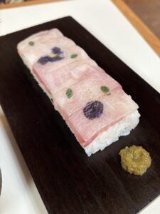 We shared pressed oshizushi, yaki onigiri grilled over binchotan, and juicy tsukune (chicken meatballs).