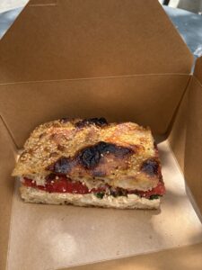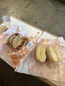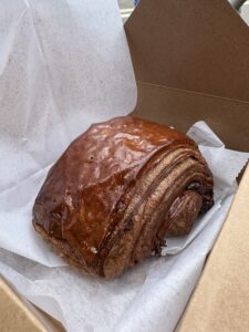 We snagged one of their last and duly famous lacquered triple-chocolate croissant (dark, milk, and white chocolate layers folded into buttery pastry) as well as a tomato-feta-mint focaccia that tasted like summer on a plate, as well as their ham and compound rosemary butter sandwich.
